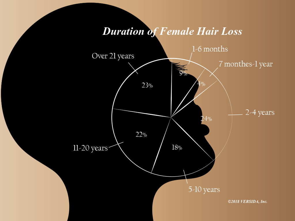 for 11 years or more with more than half reporting they have lived with hair loss for over 21 years. Thirty-eight percent of the women were between the ages of 35-44 when their hair loss began which was the largest group followed closely by 24% of those 18-24 years old. The majority of the women about 50% wear wigs to conceal their hair loss while 28% are still able to hide any hair loss they may have with their remaining hair. Less than 2% have chosen to live bald while 17% switch between wearing a wig or some other form of head covering.